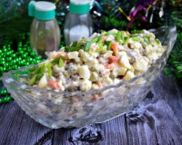Отварить до готовности куриное филе в подсоленной воде (варить 30-35 минут с момента закипания воды). Сварить вкрутую яйца (на это понадобится минут 10 с начала кипения). Отваренным картошке, моркови, куриному филе и яйцам дать остыть. ... Затем идёт слой натёртой моркови, снова сделать сеточку из майонеза. Равномерно разложить натёртые яйца и смазать этот слой майонезом. Равномерно разложить натёртые яйца и смазать этот слой майонезом.