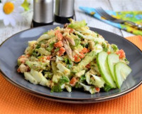 Маринованный огурец нарезаем на кубики такого же размера, как нарезаны крабовые палочки, и добавляем в миску. Сюда же выкладываем и яйцо, нарезанное достаточно мелко. Сюда же выкладываем и яйцо, нарезанное достаточно мелко. ... Заправляем салат с крабовыми палочками, огурцом, горошком и яйцами своим любимым майонезом, по вкусу солим и перчим. Заправляем салат с крабовыми палочками, огурцом, горошком и яйцами своим любимым майонезом, по вкусу солим и перчим.