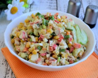 Подготовить продукты. Яйца заранее отварить в течение 10 минут после закипания воды, после этого их нужно остудить и очистить. ... Яйца и колбасный сыр натереть на крупной тёрке и переложить к крабовым палочкам и огурцам.