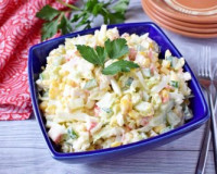 Салатик получается сочным, благодаря пекинской капусте и огурчику. А крабовые палочки, яйца и кукуруза делают его достаточно сытным. Заправить его можно не только майонезом, но и сметаной, но тогда не забудьте блюдо дополнительно подсолить. ... Варёные яйца очистите от скорлупы, некрупно нарежьте и выложите в салат из пекинской капусты, свежего огурчика, крабовых палочек и кукурузы.