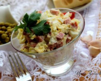 В салатнике соединить нарезанные яйца, пекинскую капусту и копчёную колбасу, добавить горошек, предварительно слив с него жидкость. В салатнике соединить нарезанные яйца, пекинскую капусту и копчёную колбасу, добавить горошек, предварительно слив с него жидкость.