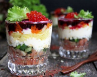 Третьим слоем в салат из картофеля и говяжьей печени выложить яйца, натертые на крупной тёрке. Третьим слоем в салат из картофеля и говяжьей печени выложить яйца, натертые на крупной тёрке. Натёртые яйца посолить и смазать 2 столовыми ложками майонеза. Натёртые яйца посолить и смазать 2 столовыми ложками майонеза.