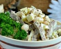 Затем выкладываем 2 киви, очищенных от кожуры и порезанных кубиками. Разделяем яйца на белки и желтки. В майонез добавляем чеснок, пропущенный через пресс, и перемешиваем. На слой киви выкладываем натёртые белки, смазываем майонезом. Разделяем яйца на белки и желтки. В майонез добавляем чеснок, пропущенный через пресс, и перемешиваем.
