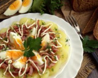 Готовую картошку остудить, очистить от кожуры, нарезать на кружочки толщиной 1-1,5 сантиметра. Яйца отварить вкрутую (в течение 10 минут после закипания воды). Охладить, очистить, нарезать четвертинками. Яйца отварить вкрутую (в течение 10 минут после закипания воды). Охладить, очистить, нарезать четвертинками.