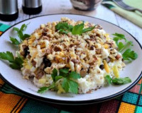 Отвариваем яйца вкрутую (варим с начала кипения воды 8-10 минут), очищаем. Куриное филе отвариваем в течение 35-40 минут в подсоленной воде, остужаем. ... Следующим слоем выкладываем яйца, натёртые на крупной тёрке, сверху наносим сеточку из майонеза.