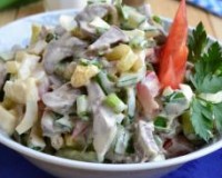 Затем брусочками или дольками нарезать вареное яйцо и тоже добавить в салат. Зеленый чеснок измельчить и добавить его в салат. ... Затем брусочками или дольками нарезать вареное яйцо и тоже добавить в салат. Посолить и поперчить, добавить майонез.