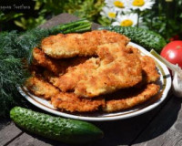 В это время подготовим всё необходимое для панировки отбивных. Яйца разобьём в миску. В это время подготовим всё необходимое для панировки отбивных. Яйца разобьём в миску. Добавим к яйцам молотый чёрный перец, соль, специи и размешаем вилкой получившийся яичный кляр до однородности.