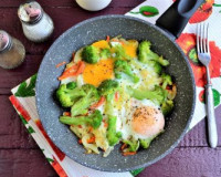 Далее в сковороду с овощами разбить яйца, посолить их. Посолить овощи по вкусу, перемешать и обжаривать в течение 3-4 минут, не забывая иногда перемешивать. Далее в сковороду с овощами разбить яйца, посолить их. Сразу добавить мелко нарезанный зубчик чеснока. Сразу добавить мелко нарезанный зубчик чеснока.