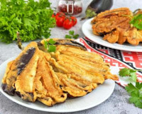 Для приготовления баклажанов, жареных веером в кляре на сковороде, потребуется: баклажаны - 3 шт.; яйцо - 2 шт.; мука - 70 г; молоко - 1-2 ст. л.; растительное масло для жарки; соль, чёрный молотый перец - по вкусу. ... Для получения кляра нужно взять объёмную миску, она должна быть такого размера, чтобы в дальнейшем в неё полностью в длину поместился весь веер из баклажана. В миску вбить яйца, добавить соль и чёрный молотый перец, перемешать венчиком до однородности.