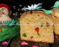 ... мука - 160 г; яйца - 3 шт.; сахар - 130 г; сметана - 2 ст. л.; масло сливочное - 120 г; масло растительное - 1 ст. л.; цедра 1 лимона; изюм - 100 г; разрыхлитель - 1,5 ч. л.; ванилин - щепотка.