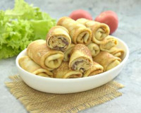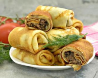 молоко - 500 мл; пшеничная мука - 170 г; яйцо - 2 шт.; сахар - 1 ч. л.; соль - 0,5 ч. л.; растительное масло - 2 ст. л. ... Прежде всего замесим блинное тесто, для этого в достаточно объёмную миску разбиваем яйца, добавляем к ним сахар и соль, перемешиваем венчиком в течение 2-3 минут.