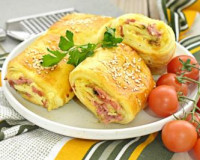 Для приготовления слоек с колбасой и сыром в аэрогриле потребуется: слоёноетесто покупное - 250 г; колбаса - 80 г; сыр твёрдых сортов - 70 г; яичный желток - 1 шт.; зелень (у меня - укроп) - 1 веточка (по желанию); кунжут - 1 ст. л.; мука для раскатки теста. ... Слоёноетесто должно подрумяниться в процессе выпечки. Включаем аэрогриль на 160 градусов.