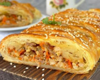 Предлагаю испечь из слоёноготеста сытный пирог в виде косички с сочной начинкой из мясного фарша. ... В конце оставшуюся узкую часть слоёноготеста завернуть на начинку и накрыть полосками теста, сформировав вот такой пирог-косичку с мясом.