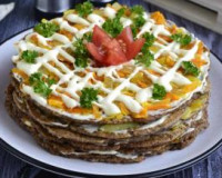 Торт, приготовленный из печени с прослойкой из лука, моркови и майонеза, - замечательный вариант закуски. Готовится этот слоёный тортик достаточно просто, из доступных продуктов, а получается аппетитным, вкусным и сытным. ... На середину разогретой сковороды выкладывать по 3-4 столовых ложки печёночного теста, разравнивая, чтобы получился круглый корж. Снова перемешать печёночное тесто (до однородности).