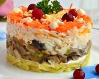 Предлагаю для праздничного стола приготовить совершенно простой, но очень вкусный слоёный салат с курицей, корейской морковью, маринованными грибами и сухариками. ... Салат получается довольно сытным. Формировать этот слоёный салат можно с помощью кулинарного кольца или же выкладывать его слоями в салатник.