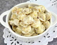Сливки практически все впитаются в тесто пельменей. Перемешивая пельмени со сливками каждые 4 минуты, готовить до звукового сигнала аэрогриля. Сливки практически все впитаются в тесто пельменей. Нежные, вкусные пельмени, хорошо пропитанные сливками, переложить из чаши аэрогриля на тарелку и в горячем виде подать к столу.