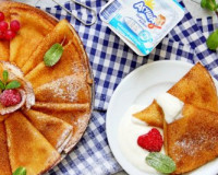 В получившуюся яично-творожную массу всыпать муку. Перемешать тесто, оно получится однородным и густым. Влить молоко в блинное тесто в несколько приёмов, каждый раз перемешивая тесто до однородности. Перемешать тесто, оно получится однородным и густым. Влить молоко в блинное тесто в несколько приёмов, каждый раз перемешивая тесто до однородности.