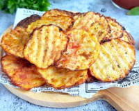 Картофельные чипсы, приготовленные в аэрогриле, - это отличная альтернатива жареным во фритюре или покупным чипсам. ... Время запекания зависит от мощности вашего аэрогриля, мощность моего аэрогриля 1350 Ватт. Запекать при температуре 200 градусов 5-7 минут (до золотистого цвета).