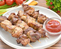 Отправляем чашу с шашлыками из свинины на шпажках в аэрогриль. Выставляем температуру 200 градусов, время - 35 минут. Через 15 минут с начала запекания достаём чашу из аэрогриля, шашлычки переворачиваем, снова отправляем в аэрогриль. ... Через 15 минут с начала запекания достаём чашу из аэрогриля, шашлычки переворачиваем, снова отправляем в аэрогриль. Запекаем ещё 10 минут, снова переворачиваем и запекаем оставшееся время.