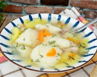 Тесто легко отделяется от горячей ложки. Опустить в суп чайную ложку, чтобы она согрелась (это нужно для того, чтобы от неё в дальнейшем лучше отделялось тесто). Затем сразу набирать по половине чайной ложки манного теста и опускать в суп с курицей. Тесто легко отделяется от горячей ложки.