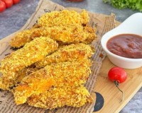 Отправить чашу в аэрогриль. Выставить температуру аэрогриля 180 градусов, время - 20 минут. ... Выставить температуру аэрогриля 180 градусов, время - 20 минут. Запекать куриные стрипсы в аэрогриле до золотистого цвета.