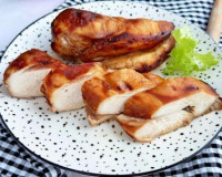 Отправить чашу в аэрогриль. Дно чаши аэрогриля застелить куском пергаментной бумаги, выложить куриную грудку, замаринованную в соевом соусе. Отправить чашу в аэрогриль. Выставить температуру 180 градусов, время - 25 минут. Через 15 минут с начала запекания перевернуть куриную грудку на другую сторону и продолжить готовить в аэрогриле оставшееся время.
