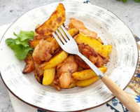 Выложить картошку вместе с филе бедра курицы на решётку в чашу аэрогриля. Выложить картошку вместе с филе бедра курицы на решётку в чашу аэрогриля. Установить чашу в аэрогриль, выставить температуру 160 градусов, время - 30 минут. Во время приготовления пару раз достать чашу из аэрогриля и встряхнуть картошку с курицей (или перемешать).