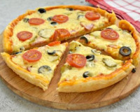 Подготовить необходимые ингредиенты для приготовления пиццы на слоеномтесте: Подготовить необходимые ингредиенты для приготовления пиццы на слоеномтесте: Слоеноетесто тонко раскатать, выложить на противень, застеленный бумагой для выпечки, хорошо наколоть вилкой, чтобы тесто не поднималось в духовке. ... Пицца на слоёномтесте готова! Приятного аппетита! Приятного аппетита!