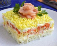 Чаще всего салат "Мимоза" готовится по классическому рецепту - с рыбными консервами, но в наше время существует множество вариантов этого блюда, в том числе и с солёной рыбой. ... Аккуратно формочку снять, а очень вкусный, яркий салат "Мимоза", приготовленный с красной рыбой, украсить розочкой из красной рыбки и зеленью.